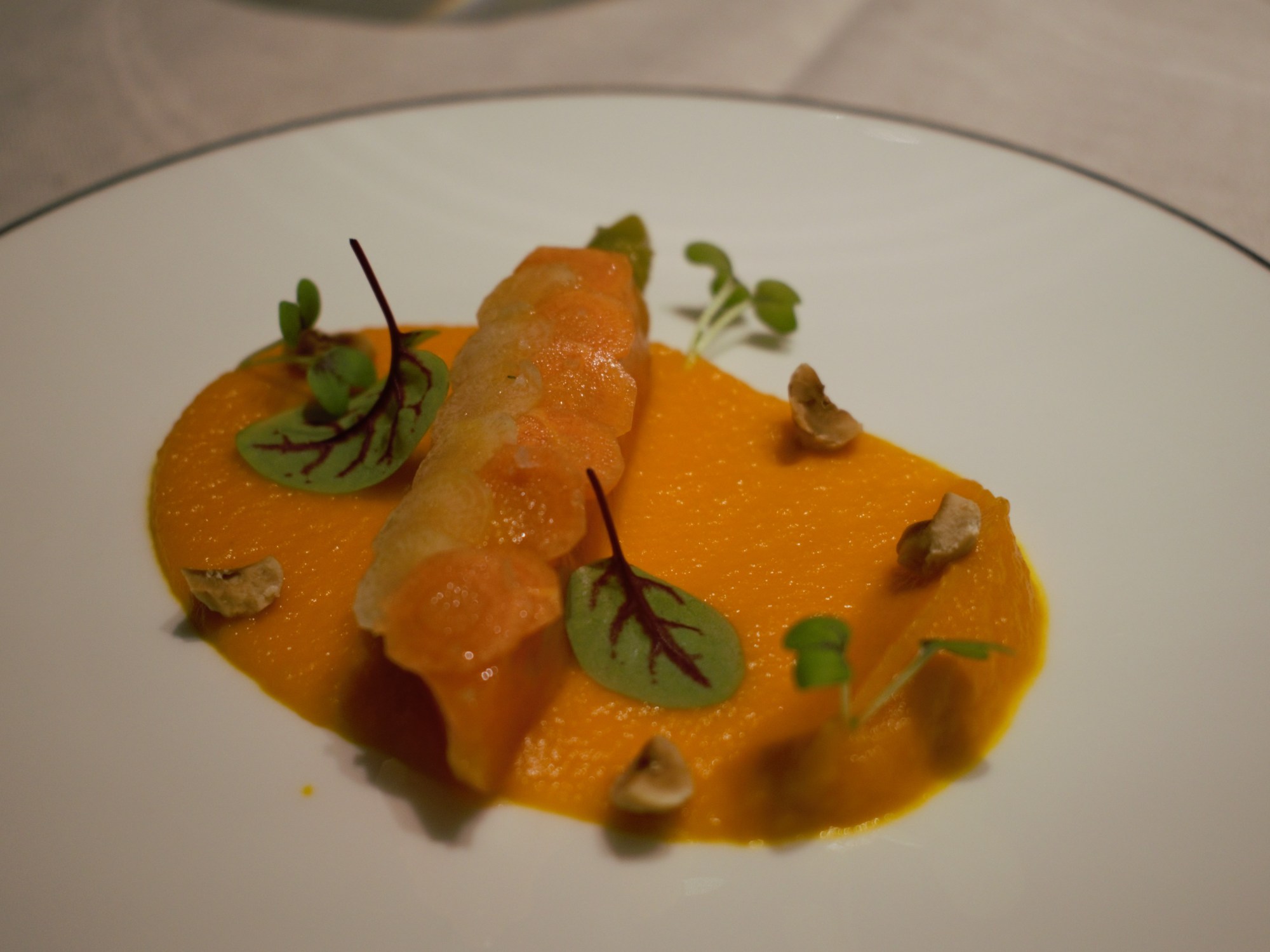 I had the tasting menu of the day which was catered towards my vegetarian diet with wine pairing for each course. I firstly enjoyed a glass of red Savoie wine in the comfy bar area which was accompanied with mixed nuts and an option of cheese and cured meat. The restaurant staff were professional yet welcoming and made me feel at ease as I waited for my table to be prepared. The bar has a huge fireplace which gives the area a relaxing feel and cosy atmosphere.